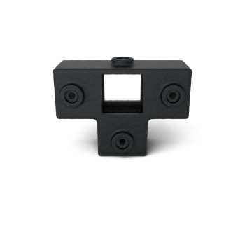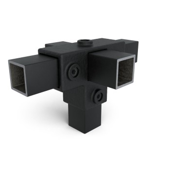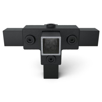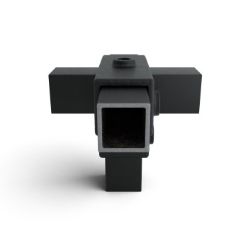 Auf Lager - Versand in 2–9 WerktagenT-Stück für Stützrohr - 40 mm. 3-Richtungs-Verbinder zur Befestigung von Stützen mit 3 horizontalen Rohren, die lotrecht zueinander angeordnet sind. Das Stützenrohr paßt durch den Verbinder.