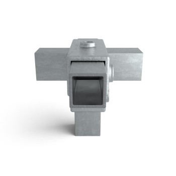 Auf Lager - Versand in 2–9 WerktagenT-Stück für Stützrohr - 40 mm. 3-Richtungs-Verbinder zur Befestigung von Stützen mit 3 horizontalen Rohren, die lotrecht zueinander angeordnet sind. Das Stützenrohr paßt durch den Verbinder.