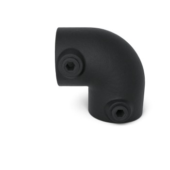 In stock - shipping in 2–9 business daysElbow 90°. Elbow joint fitting used as an end fitting for the top rail. Another big plus of the black coating is, that the color gets into the material really deeply, which prevents the connectors from corroding too quickly. The paintwork is not resistant to UV radiation and is therefore not suitable for outdoor use. The tubefittings are equipped with black colored stainless steel adjusting screws with cutting edge.