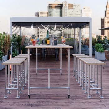 The structure is supplied as a self-assembly kit, with KLEMP pipes and connectors. Assembly takes just a few minutes using a single Allen key. In addition, you can adjust the table slightly to uneven ground, such as a stone floor in a restaurant garden.