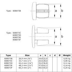 All tubefittings are marked with a size that corresponds to the dedicated tube diameter. For example, in the case of D - 42 mm tubefittings, the diameter of the tube dedicated is 42 mm. It is worth noting that each tubefitting features a certain clearance, as the tube is assembled inside the tubefitting with the use of a dedicated set screw. Therefore, a slightly smaller or larger tube should be about fine.
