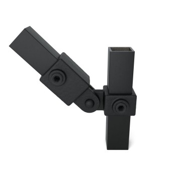 Articulación giratoria simple para tubos cuadrados. Ofrece conexiones móviles en estructuras ajustables. Disponible en plata y negro.