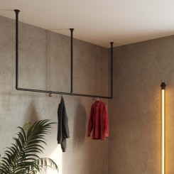 ESTILO INDUSTRIAL: Tanto en el ámbito privado como en el comercial, los zapatos, los utensilios de cocina, los bolsos u otros artículos como las toallas pueden colgarse con estilo en la robusta barra de ropa para ahorrar espacio.