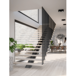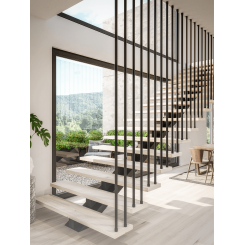 El arpa es adecuada para todo tipo de diseños de escaleras, independientemente del tamaño del espacio disponible. Lo importante es que ocupa considerablemente menos espacio que la barandilla clásica con pasamanos.