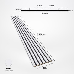 Ofrecemos tres tamaños de listones: listón ESTÁNDAR 30x40 (mm), listón MINI 16 x 30 mm, listones HORIZONTALES 22 x 70 y 22 90 mm y paneles en fieltro y HDF 30 x 275 cm.