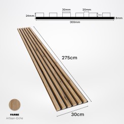 Ofrecemos tres tamaños de listones: listón ESTÁNDAR 30x40 (mm), listón MINI 16 x 30 mm, listones HORIZONTALES 22 x 70 y 22 90 mm y paneles en fieltro y HDF 30 x 275 cm.