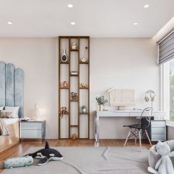 Una estantería separadora ayuda a estructurar el espacio, mejorando la organización y el confort en el área de trabajo.