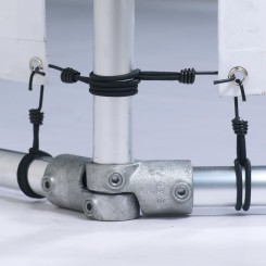 Pour les murs de plus de 200x200 cm, des tubes supplémentaires sont utilisés pour renforcer la structure et sont fixés verticalement. Le tube de renforcement est fixé à l'aide de raccords de dérivation de manière à ce que le renforcement soit placé sous la bannière publicitaire. Si des bannières imprimées recto-verso sont montées sur la structure, il faut se rappeler que le tube de renfort couvrira l'impression de la bannière d'un côté (plus le mur est grand, plus on utilise de renforts dans la structure).