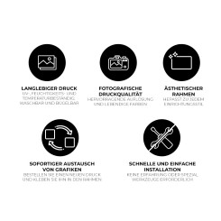 Les profils en aluminium et les angles d'aluminium sont montés dans un cadre à l'aide de la touche Allen attachée. Chaque image en tissu est fournie avec un cèdre en silicone. Le cèdre est enfoncé dans la rainure prévue dans le cadre en aluminium afin que l'image puisse être jointe ou remplacée sur la page respective sans outils.