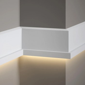 Le bandeau mural MD025, fabriqué en matériau PolyForce, est très résistant à l'eau et aux radiations UV. La technologie ScratchShield® durcit la surface, améliorant sa résistance aux rayures et aux impacts. Le profil présente un design large et simple avec une finition décorative en bas, ce qui le rend adapté à divers intérieurs, y compris les zones sensibles à l'humidité. Il est conçu pour l'installation d'éclairage LED, avec un espace pour dissimuler les fils et les bandes LED. La technologie LightGuard assure une distribution uniforme de la lumière. Un revêtement spécial facilite la peinture. Dimensions : 200 x 11 x 2,7 cm.