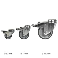 Ruota girevole con freno, senza espansore Con noi puoi scegliere tra tre dimensioni di ruote girevoli: Ø 50, Ø 75 e Ø 100 mm. Con queste, tra l'altro, è possibile realizzare tavoli mobili, carrelli e altri mobili. Sono adatte per tubi con diametro di 26,9 mm, 33,7 mm, 42,4 mm, 48,3 mm e per profili di tubi quadrati di 40 x 40 mm. L'articolo ZW050 è dotato di un freno singolo, mentre gli articoli ZW075 e ZW100 sono dotati di un freno doppio.