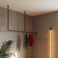 Modello Wuppertal: l'appendiabiti doppio con dimensioni H100 x L200 (2x100) cm richiede il montaggio a soffitto e a parete con 3 punti di appoggio. Poco ingombrante e incredibilmente stabile, è ideale per le boutique e gli atelier di moda.