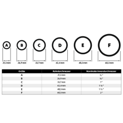 Nella nostra offerta troverete connettori rotondi con diametri di 21,3 mm, 26,9 mm, 33,7 mm, 42,4 mm, 48,3 mm, 60,3 mm.