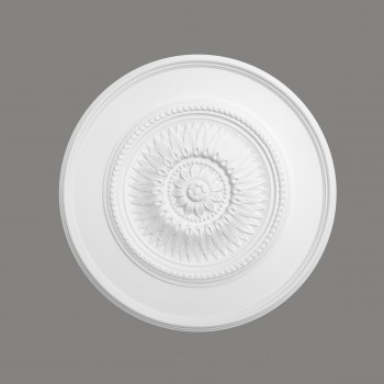 Op voorraad - Verzending binnen 5-8 dagenRozet B3023 is een decoratief stucelement dat is ontworpen voor installatie op plafonds of muren, gemaakt van een lichtgewicht, duurzaam materiaal dat bestand is tegen water, UV-straling en mechanische beschadiging. Het heeft een reliëf motief van bloemen in het midden, aangevuld met ringen en banden langs de randen. De rozet kan worden geschilderd, zodat deze in elke kleur kan worden aangepast aan individuele interieurontwerpen. Voor de installatie zijn geen gespecialiseerde gereedschappen nodig, en het is aan te raden de lijm van de fabrikant te gebruiken. Het is bijzonder geschikt als omlijsting voor verlichtingsarmaturen of als decoratief element in ruimtes met verschillende omstandigheden, zoals badkamers, keukens of woonkamers.