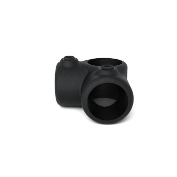 Hoekstuk doorlopendestaander 90°. Hoekverbinding (90°), waarbij de verticale buis door de klem loopt. Een bijkomend voordeel van de zwarte lak is dat deze diep doordringt in het materiaal, waardoor de koppeling een extra hoge mate van corrosiebestendigheid heeft. Het lakwerk is weliswaar niet bestand tegen UV-straling en daardoor ook niet geschikt voor buitengebruik. De buiskoppelingen zijn voorzien van zwart gekleurde RVS stelschroeven met snijrand.