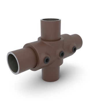 Przegub krzyżakowy typ 22. 90 ° - element łączący między elementem środkowym a wspornikiem na konstrukcji. W środkowym punkcie połączenia rura przebiega nieprzerwanie. W punktach połączeń po lewej i prawej stronie można zatem zamontować kolejne rury w płaszczyźnie pośredniej.