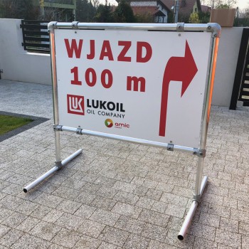 Kompletna wolnostojąca konstrukcja reklamowa. Wykonana z rur aluminiowych i złączy żeliwnych ocynkowanych.
