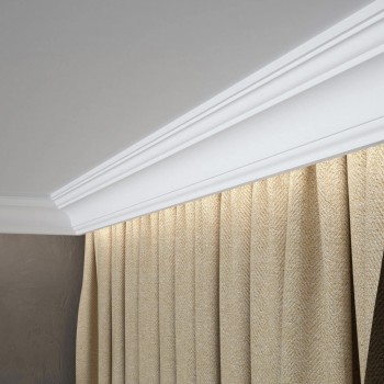 Listwa karniszowa MD213 to element maskujący karnisz, przystosowany do integracji z oświetleniem LED. Profil o delikatnie wklęsłym kształcie z dekoracyjnym frezowaniem wykonany z materiału PolyForce, odpornego na wilgoć i promieniowanie UV – nie żółknie, nie odkształca się i nie kruszy. Technologia LightGuard® zapobiega przenikaniu światła przez powierzchnię, zapewniając równomierne rozproszenie. Specjalna powłoka ułatwia malowanie farbami wodnymi. Montaż na klej montażowy, bez konieczności stosowania specjalistycznych narzędzi.