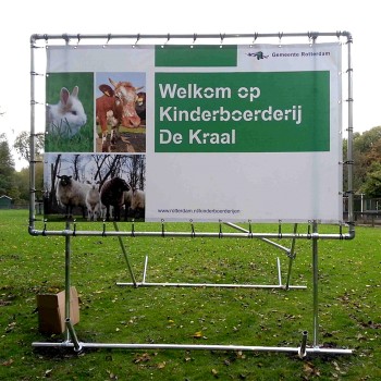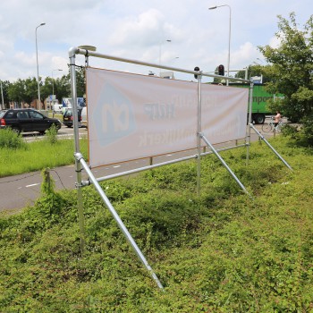 Kompletna wolnostojąca konstrukcja reklamowa. Wykonana z rur aluminiowych i złączy żeliwnych ocynkowanych.