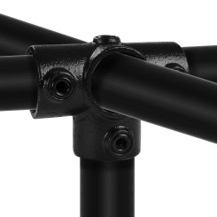 Trójnik rurowy z rurką wsporczą typ 24B, 3-kierunkowy łącznik do mocowania kolumn z 3 poziomymi rurami ułożonymi prostopadle względem siebie. Rura kolumny mieści się w złączu. To złącze jest przewidziane do połączenia z rurą wsporczą. Z ciągłej rury nośnej z trzech innych rur można podłączyć pod kątem prostym. Trzy rury łączące odbiegają od rury wsporczej w trzech różnych kierunkach